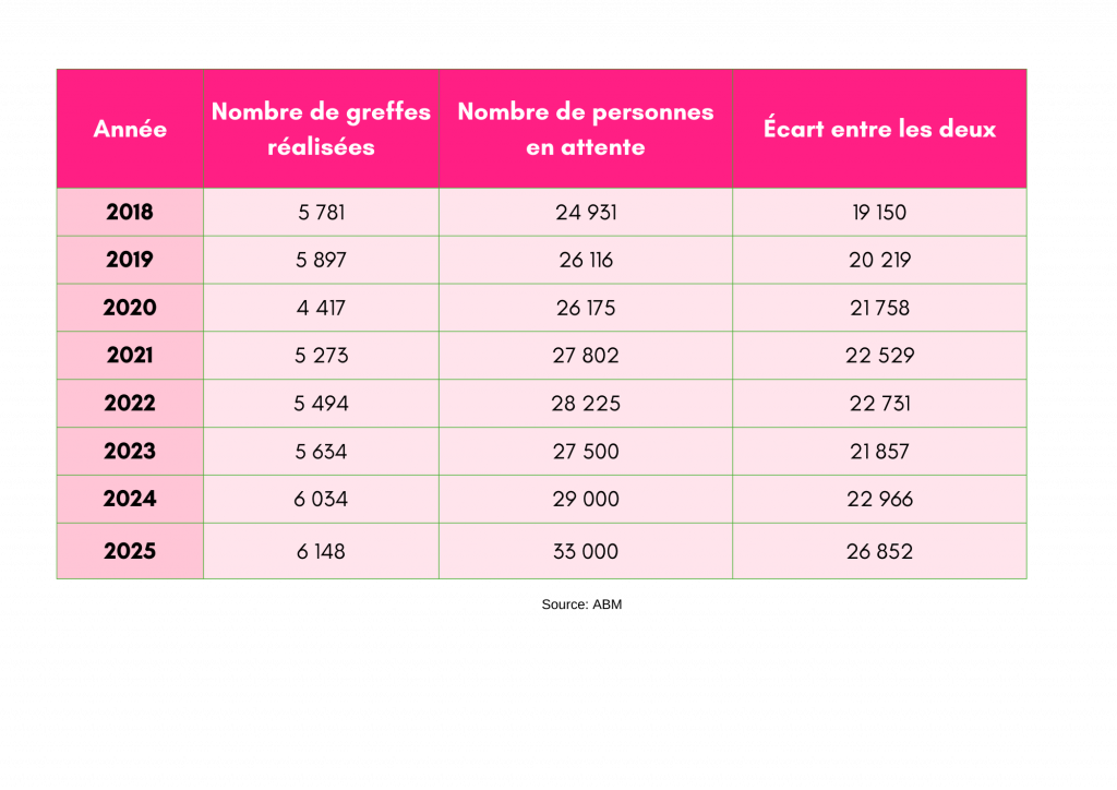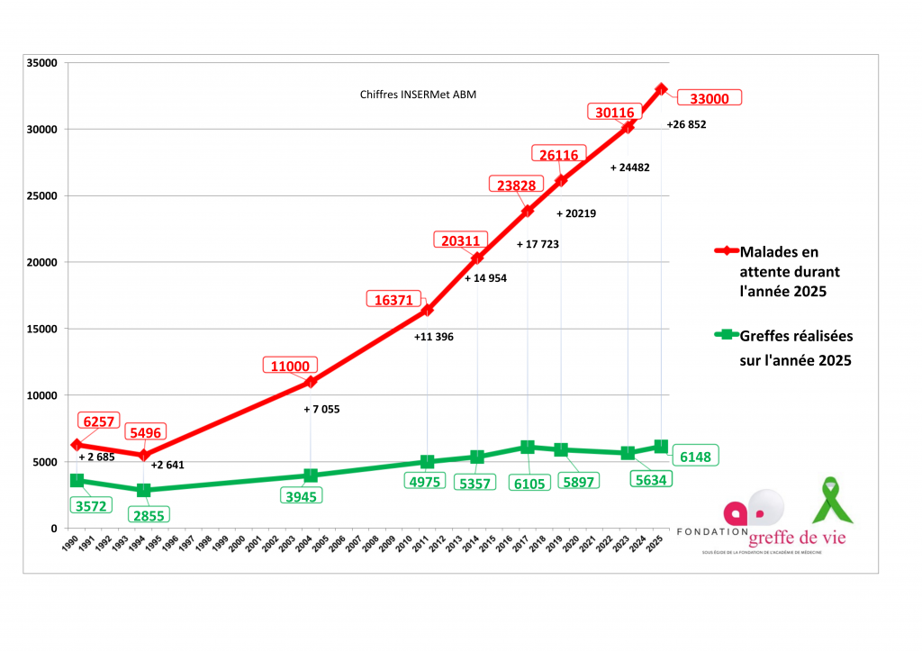 Le nombre de greffes réalisées chaque année est de l’ordre de 6000, un nombre dérisoire face au nombre grandissant de patients en attente d’une greffe, aujourd’hui estimé à 33 000. Chaque année, environ un millier de personnes décèdent, faute de greffons.